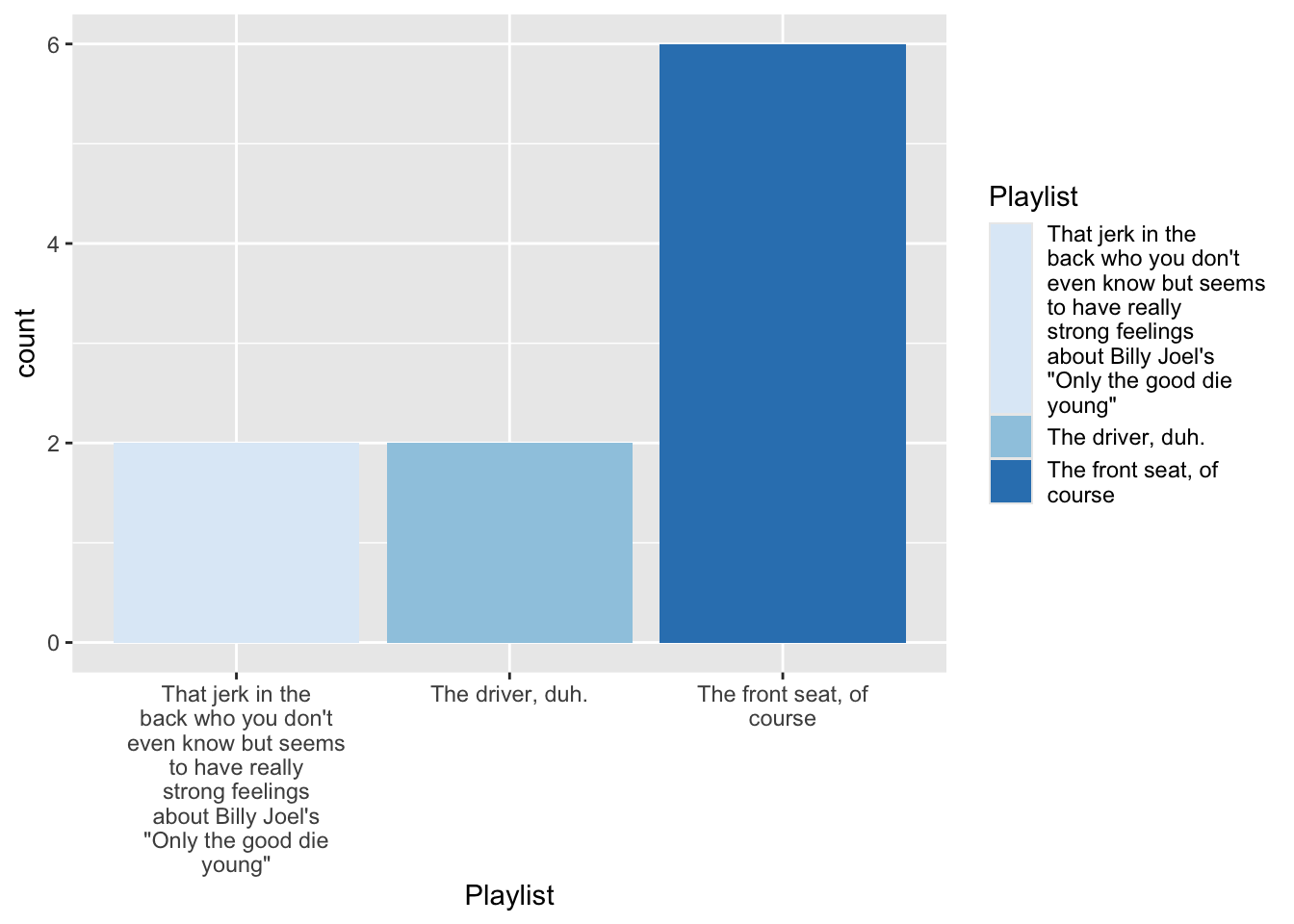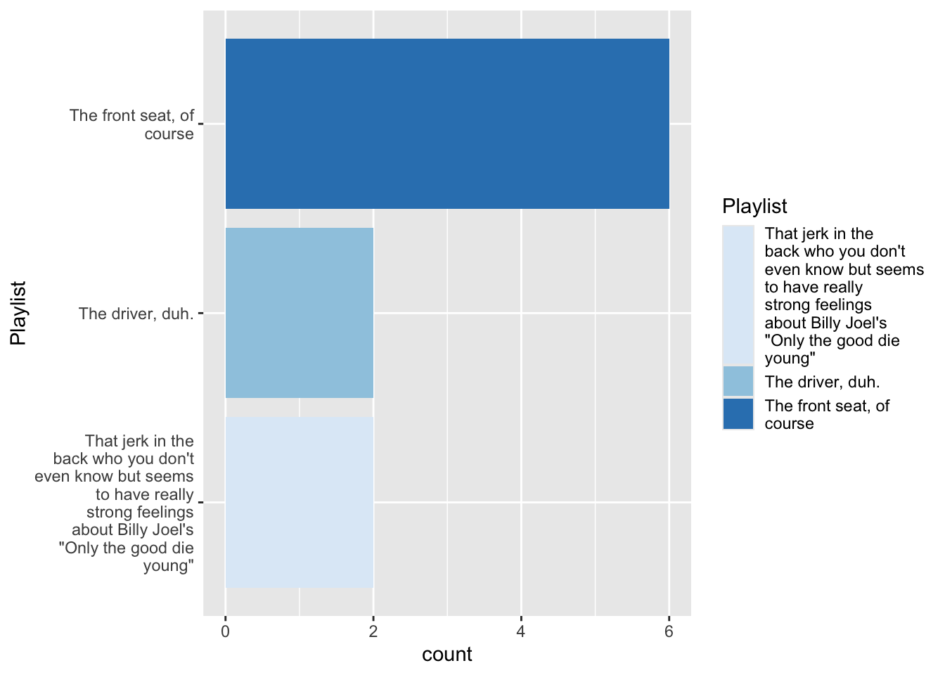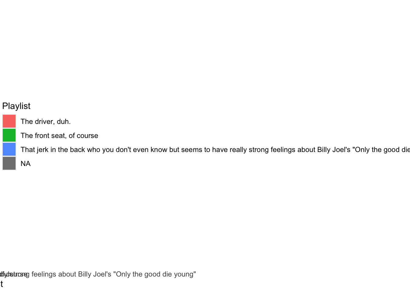 fill aestheticdf %>% filter(!is.na(trip)) %>% mutate( Playlist =str_wrap(forcats::as_factor(trip),20) ) %>% ggplot(aes(x = Playlist, fill = Playlist))+ geom_bar(stat = "count")+ scale_fill_brewer(guide="none")+ coord_flip()+ labs(title = "Who controls the playlist", x= "", y = "")-> fig_roadtripdf %>% filter(!is.na(trip)) %>% mutate( Playlist =str_wrap(forcats::as_factor(trip),20) ) %>% ggplot(aes(x = Playlist, fill = Playlist))+ geom_bar(stat = "count")+ scale_fill_brewer(guide="none")+ coord_flip()+ labs(title = "Who controls the playlist", x= "", y = "")-> fig_roadtrip