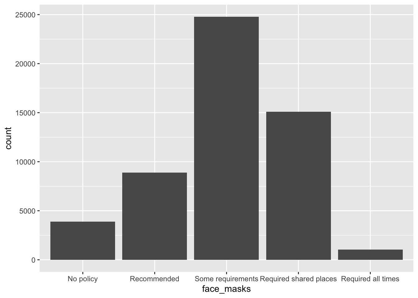 summarize() and other data wrangling skills to transform data for plottingfactor() and related functions to control order of labels on axisggplotWhat was the most common face mask policy in the data?